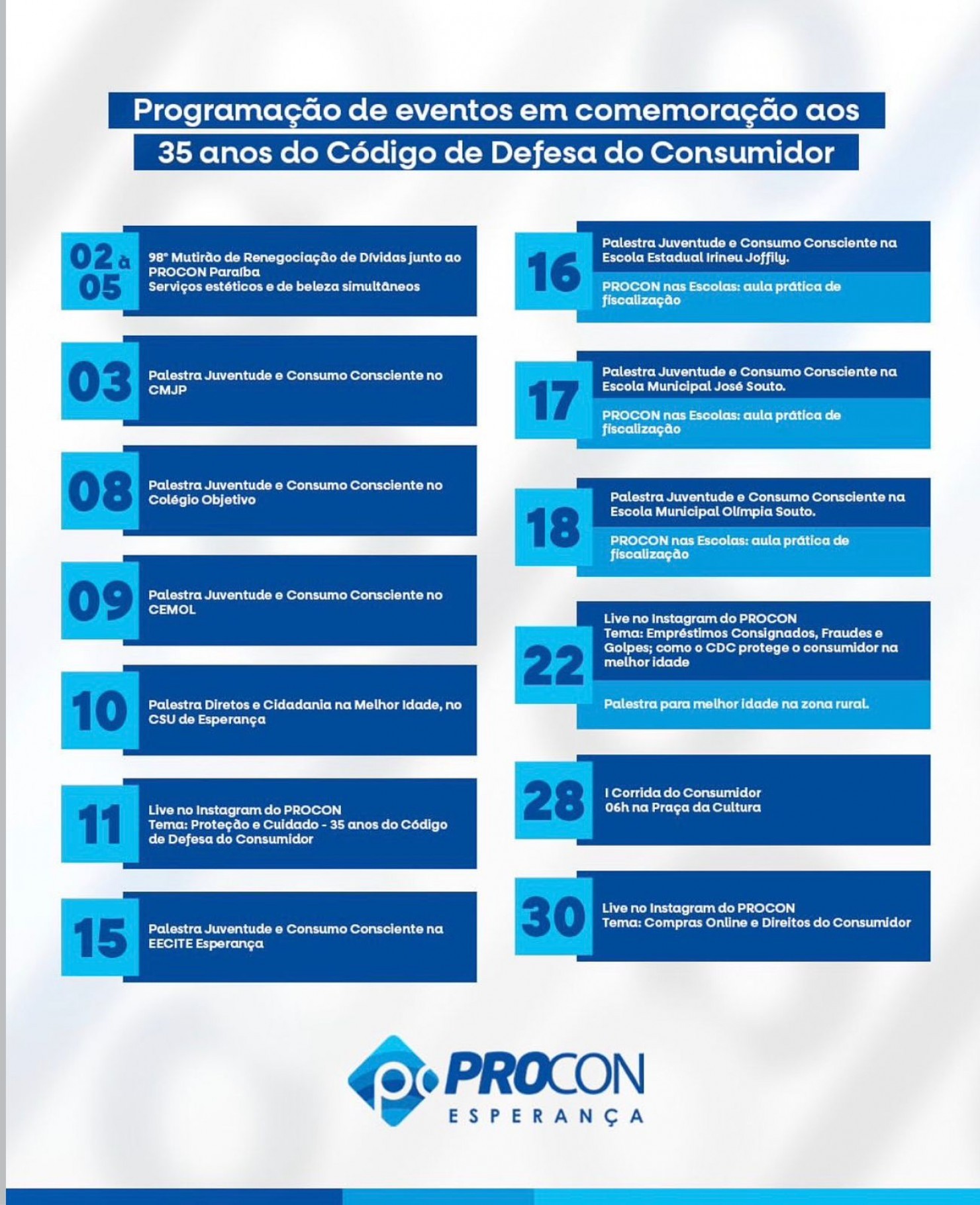 Em comemoração aos 35 anos do Código de Defesa do Consumidor (CDC), o PROCON Esperança preparou uma série de atividades ao longo do mês, com o objetivo de fortalecer os direitos dos consumidores, promover a educação financeira e incentivar o consumo consciente em toda a comunidade esperancense.